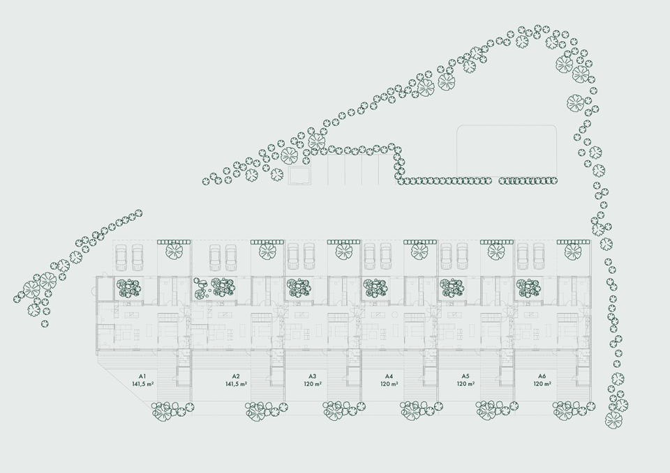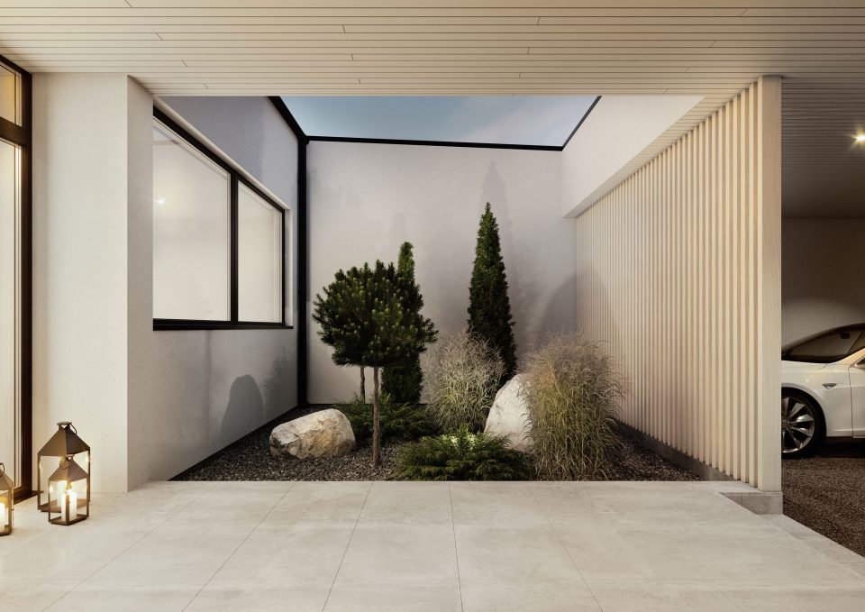 Jokaisen asunnon etupihalla, sisäänkäynnin yhteydessä sijaitsevalla atriumpihalla, on näyttävä ja valaistu istutusalue, joka on rakennettu kuin taideteokseksi havu- ja heinäkasveista sekä luonnon kivistä. Sommittelussa on otettu huomioon näkymä keittiön ikkunasta. Istutusalueelle ja atriumpihalle tulvii kauniisti valoa kattoon tehdystä valoaukosta.